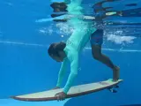 Utilize your arm strength and upper body to push the board's front underwater. Simultaneously, arch your back and press your chest onto the board, submerging it beneath the water's surface.