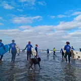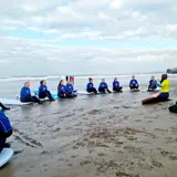 As soon as we had finished pulling on the thicker suits and boots and having a good old natter in the car park we all trooped down to the sand and split into two groups of beginners and improvers, with our amazing coaches Jenny, Lauren, Gemma and our fantastic volunteer Lizzie on hand to dish out the tips.