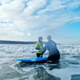 As soon as we had finished pulling on the thicker suits and boots and having a good old natter in the car park we all trooped down to the sand and split into two groups of beginners and improvers, with our amazing coaches Jenny, Lauren, Gemma and our fantastic volunteer Lizzie on hand to dish out the tips.